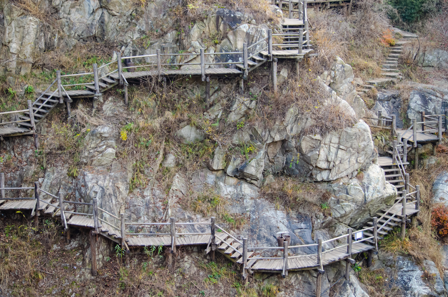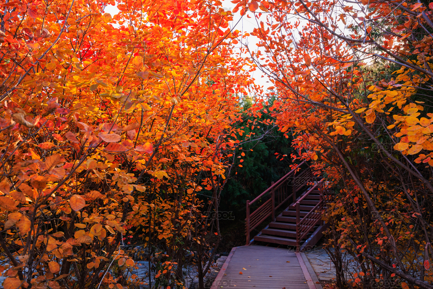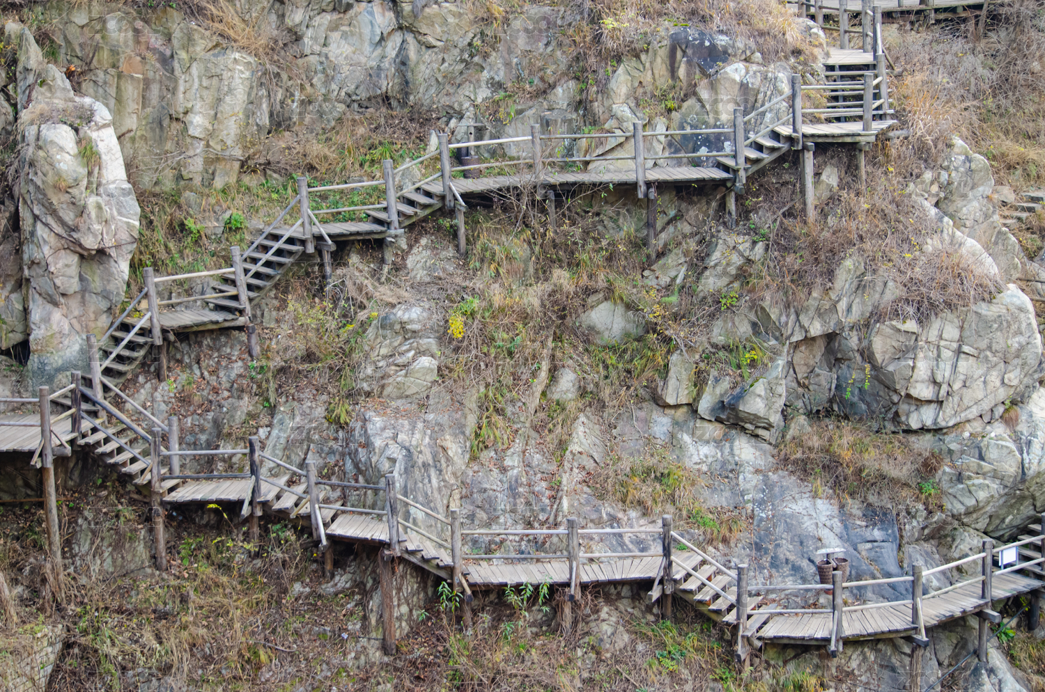 濟(jì)南市九如山紅葉谷懸崖上木制的棧道步行道