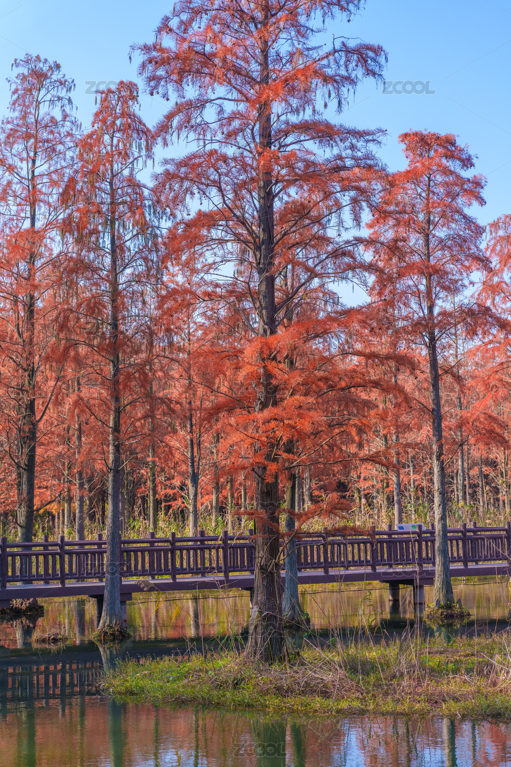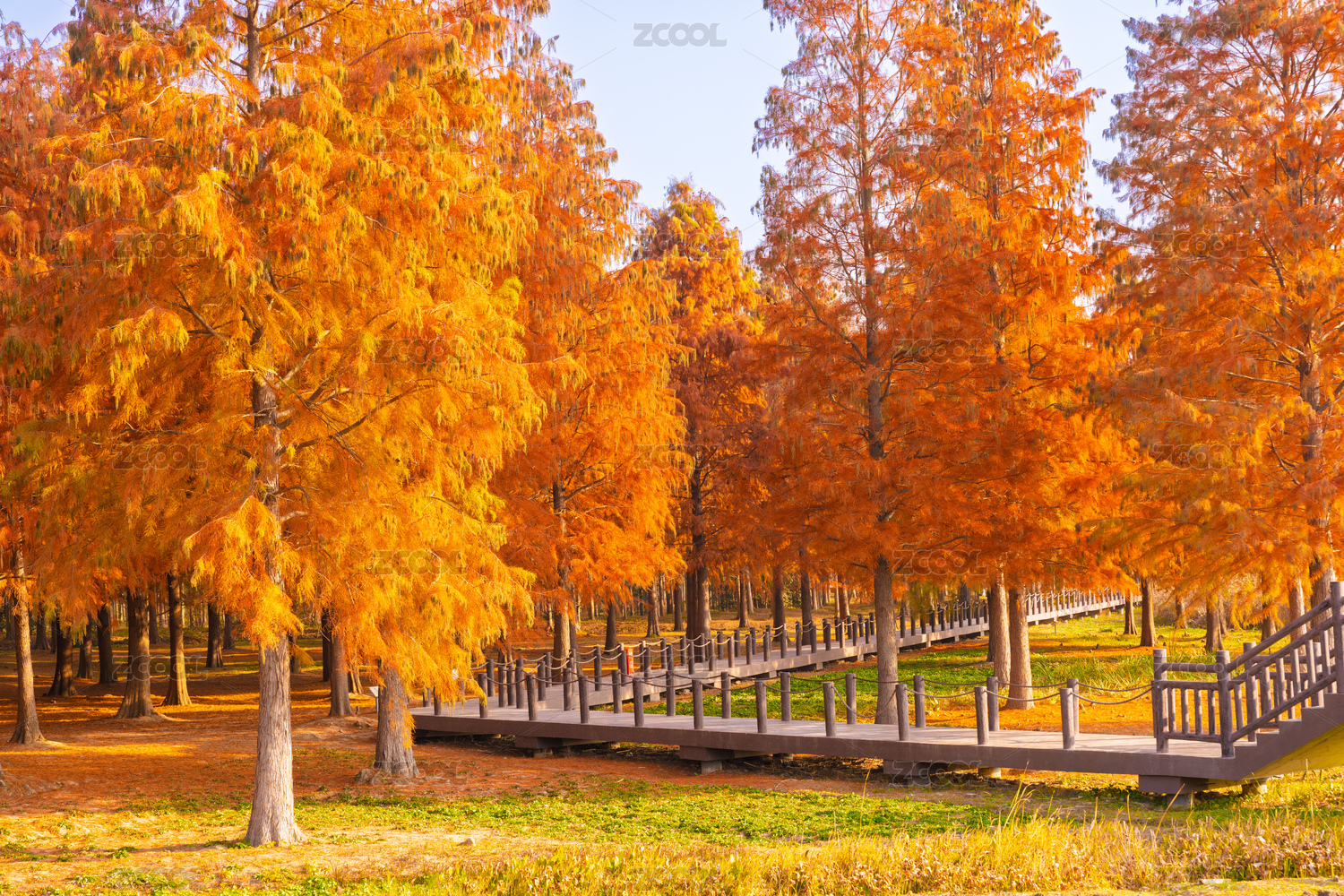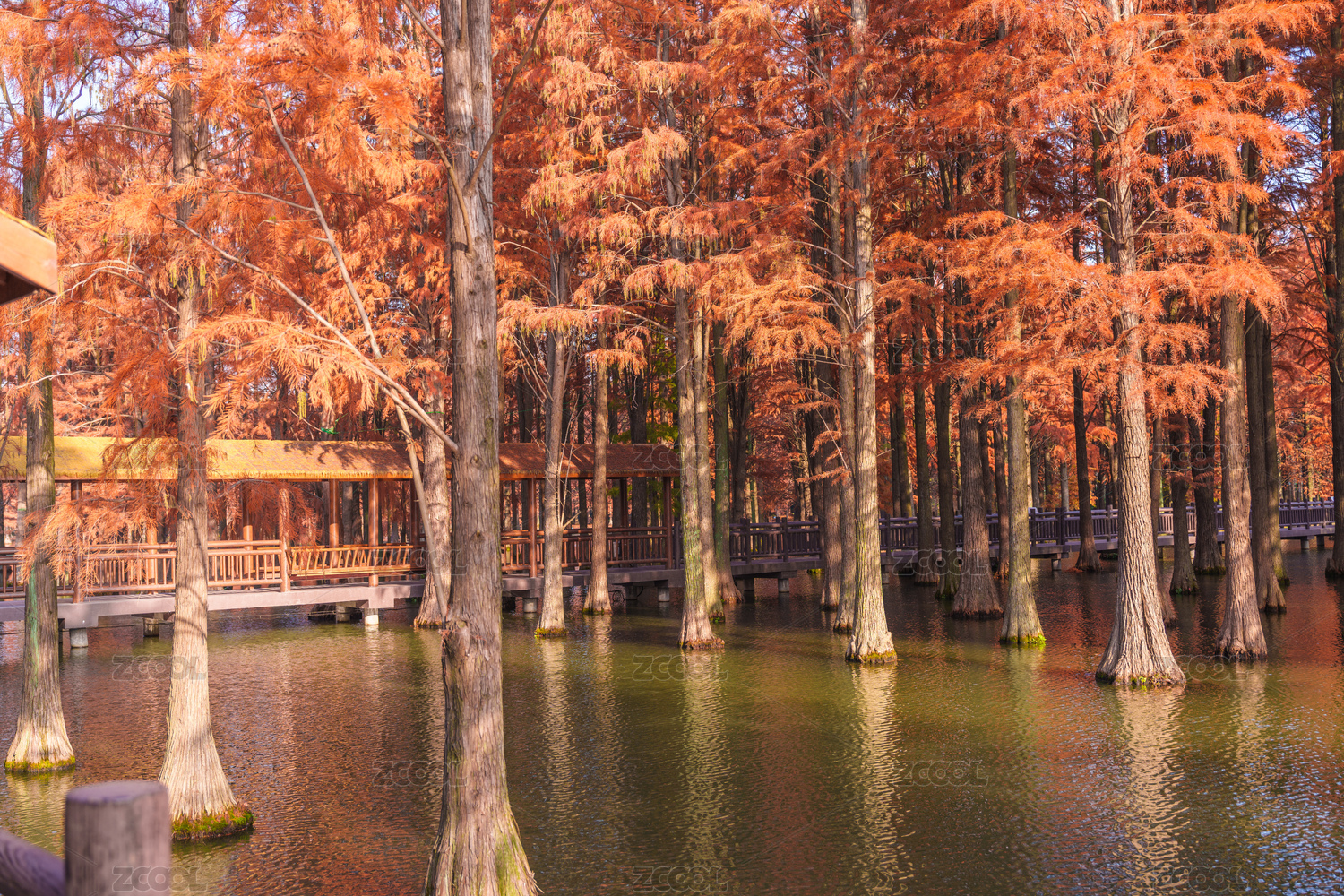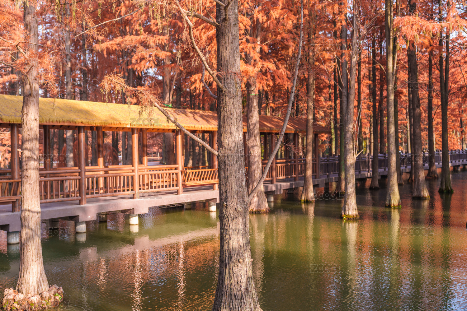 上海青西郊野公園的秋日水杉林棧道風(fēng)光