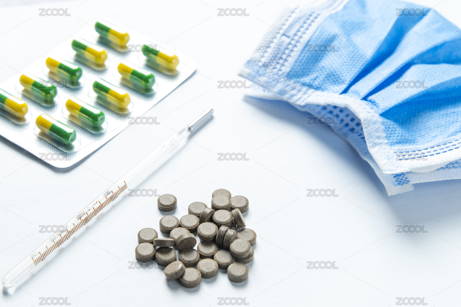 放在桌面上的溫度計(jì)和藥片