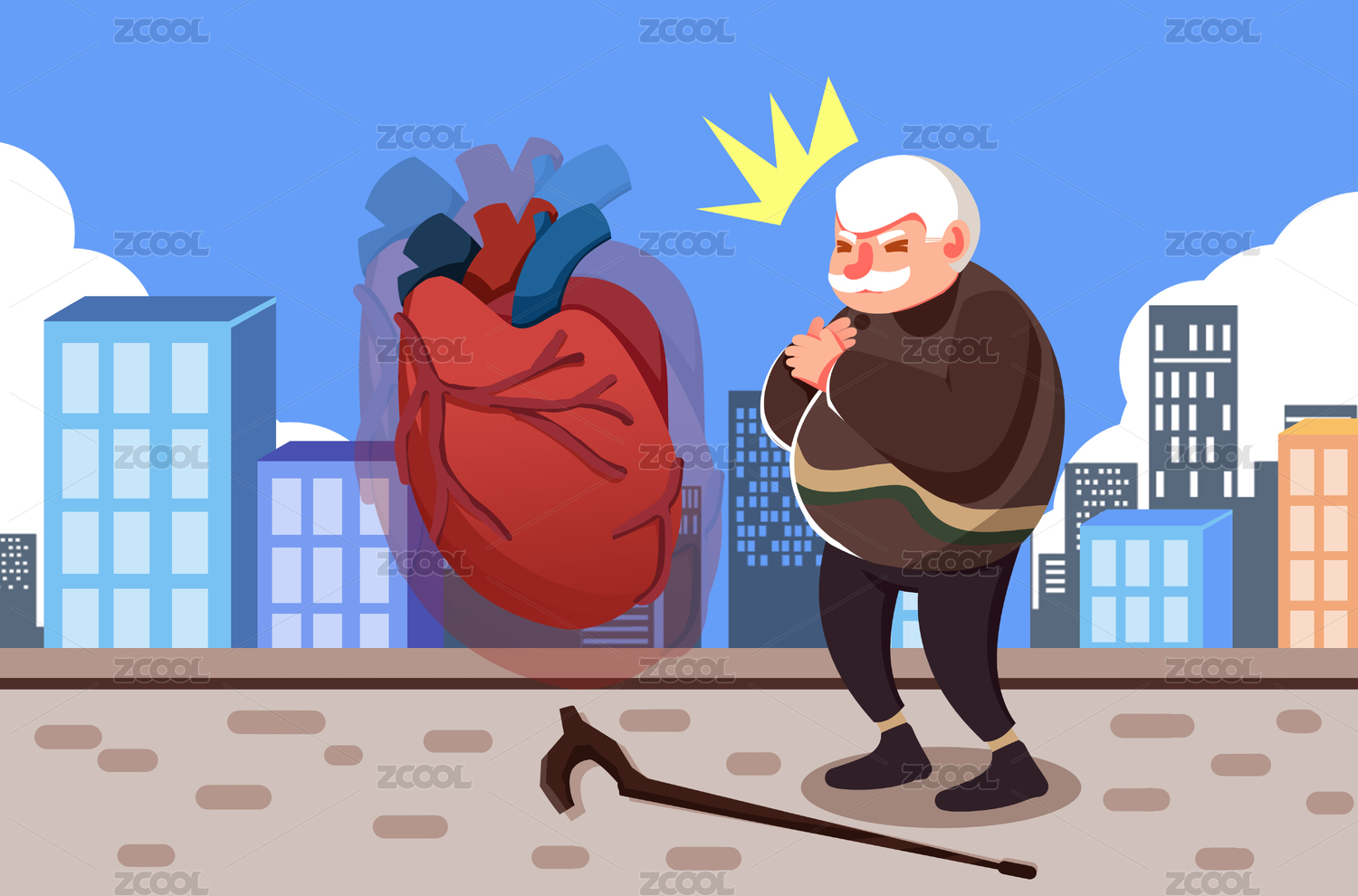 卡通手繪老人突發(fā)心梗心臟病胸口疼痛插畫