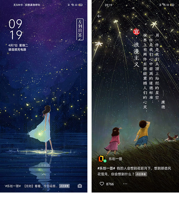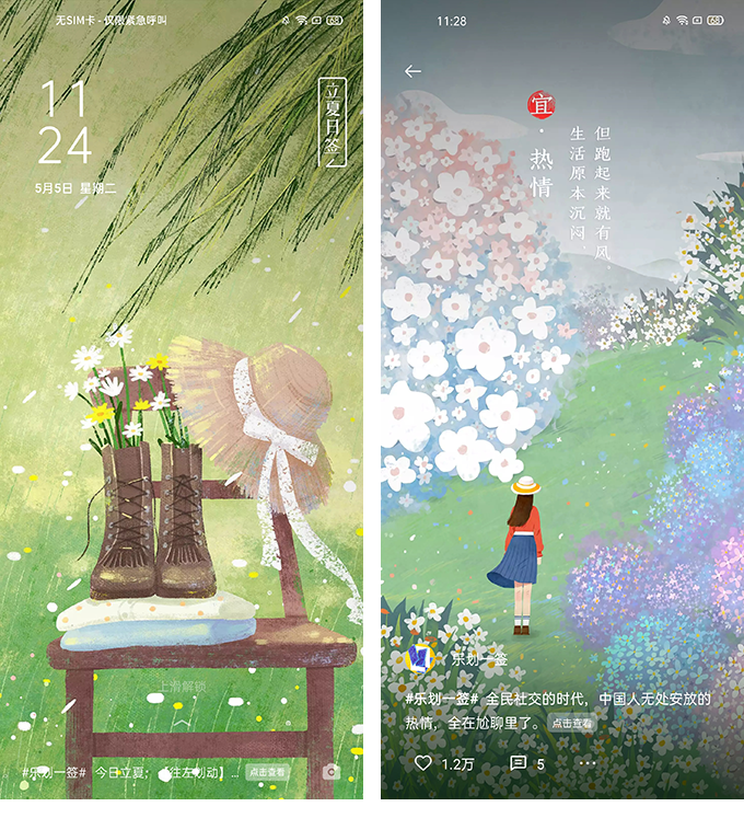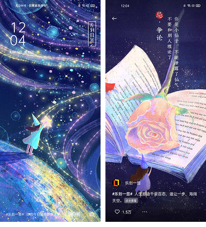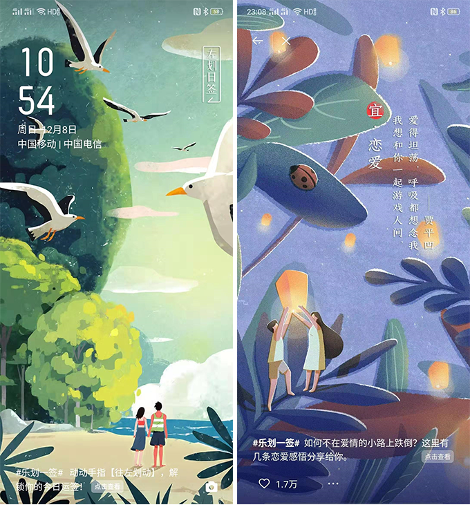 一組日簽包含兩張插畫,插畫封面會(huì)在用戶亮屏?xí)r展示,左劃操作后劃出插畫日簽。