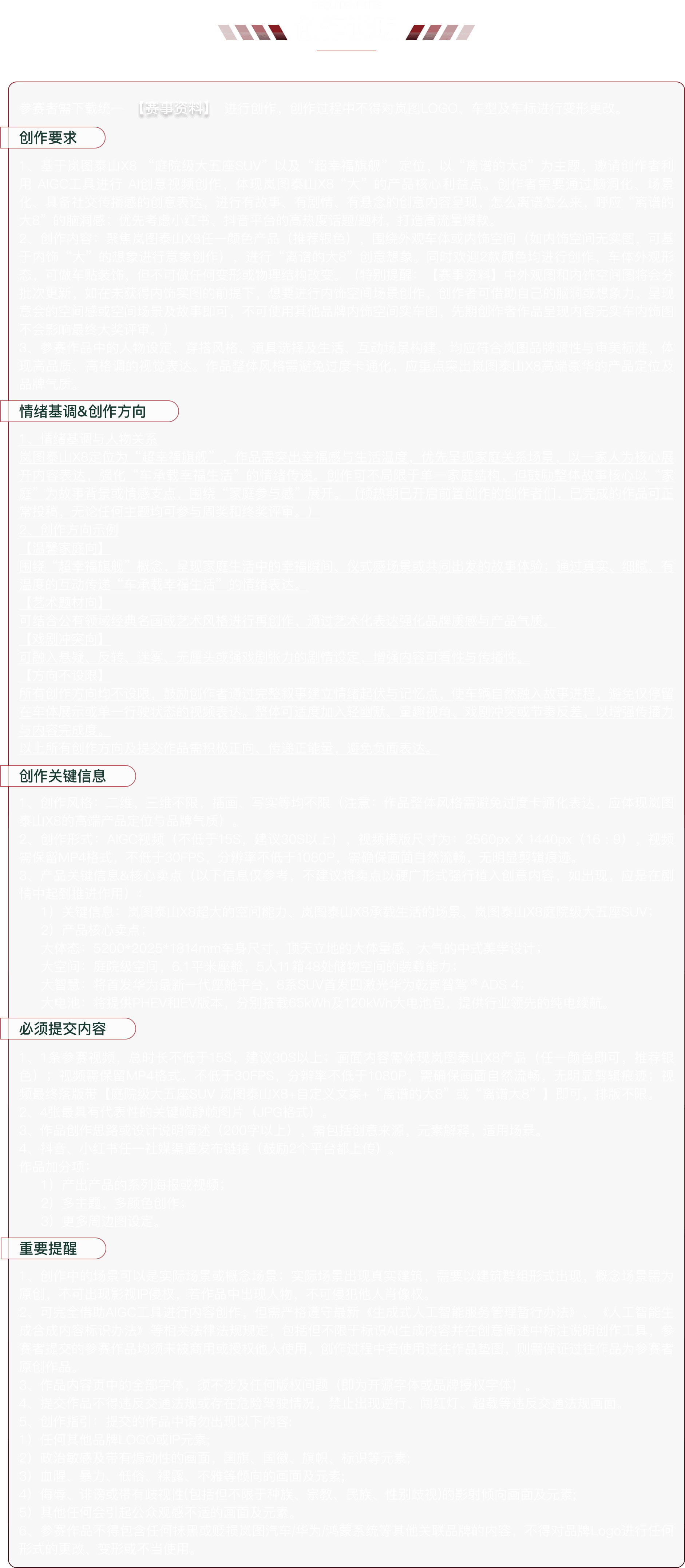 (3)AIGC規(guī)范:使用AI生成內(nèi)容(AIGC)的參賽者,須確保所用工具訓(xùn)練數(shù)據(jù)來源合法,且生成內(nèi)容不侵犯任何第三方知識產(chǎn)權(quán)(包括圖像、角色形象等)。