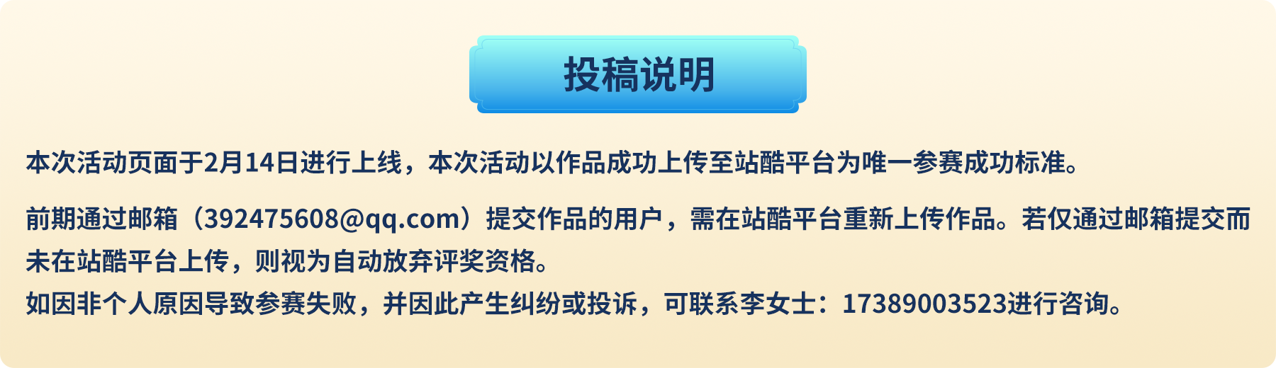 1、參賽者在提交作品前請確保已閱讀并且愿意遵守此次比賽規(guī)則,任何違反比賽規(guī)則的作品,主辦方有權取消其參賽資格。
