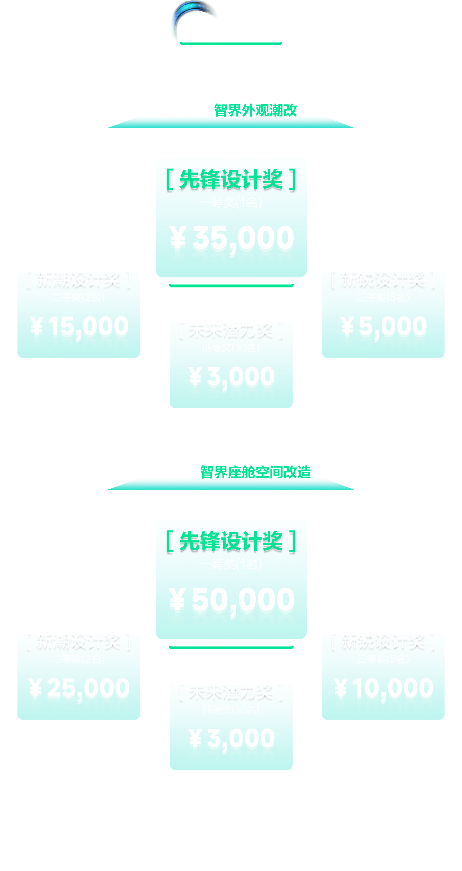 2、首輪公示僅公示賽道一(智界外觀潮改)&賽道二(智界座艙空間改造)的四等獎/未來潛力獎(20組)獲獎作品,一等獎/先鋒設計獎(2組)、二等獎/新潮設計獎(4組)、三等獎/新銳設計獎(10組)獲獎作品僅做入圍公示,不公示具體名次。