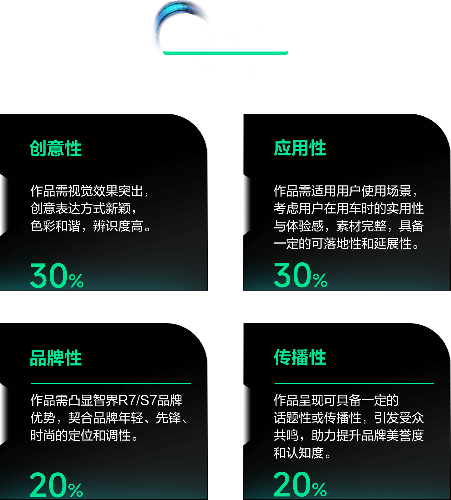 3、為配合主辦方12月線下展落展需求,賽道一(智界外觀潮改)&賽道二(智界座艙空間改造)的一等獎/先鋒設計獎(2組)、二等獎/新潮設計獎(4組)、三等獎/新銳設計獎(10組)、四等獎/未來潛力獎(20組)獲獎作者在首輪公示后請注意查收郵件,并根據(jù)郵件提示內(nèi)容及時配合主辦方完成源文件作品收集。